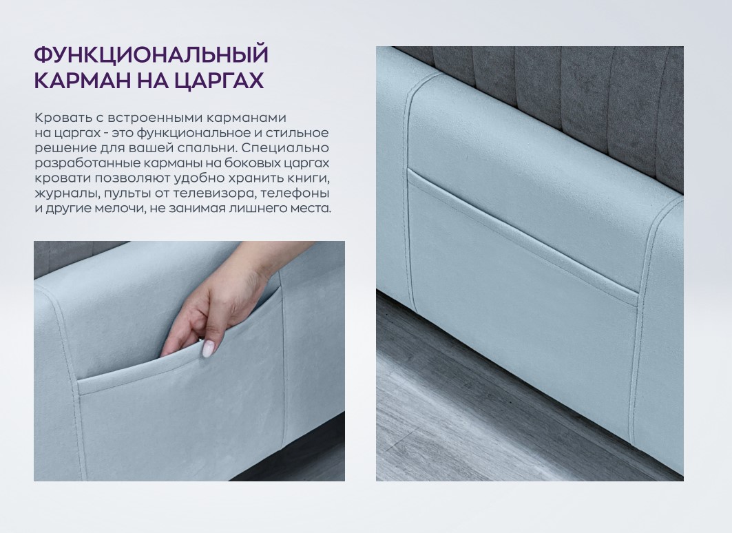 Кровать с встроенными карманами на царгах - это функциональное и стильное решение для вашей спальни. Специально разработанные карманы на боковых царгах кровати позволяют удобно хранить книги, журналы, пульты от телевизора, телефоны и другие мелочи, не занимая лишнего места.